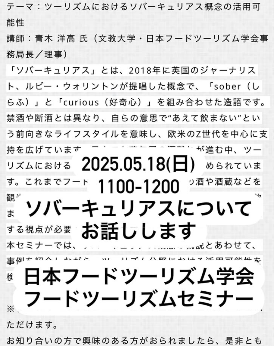 【告知】フードツーリズムセミナー(日本フードツーリズム学会)において「ソバーキュリアス」についてお話します!
