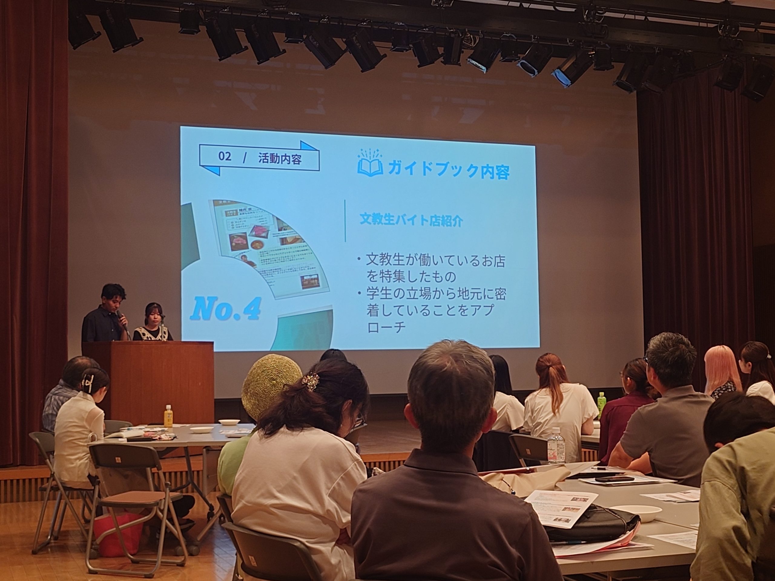 2024年11月に草加ローカルストーリーと連携して発行したグルメガイド『谷塚駅・文教大学周辺グルメガイド』の取り組みについて発表を行いました。他大学の学生とも、質疑応答を交えて活発な交流を図りました。